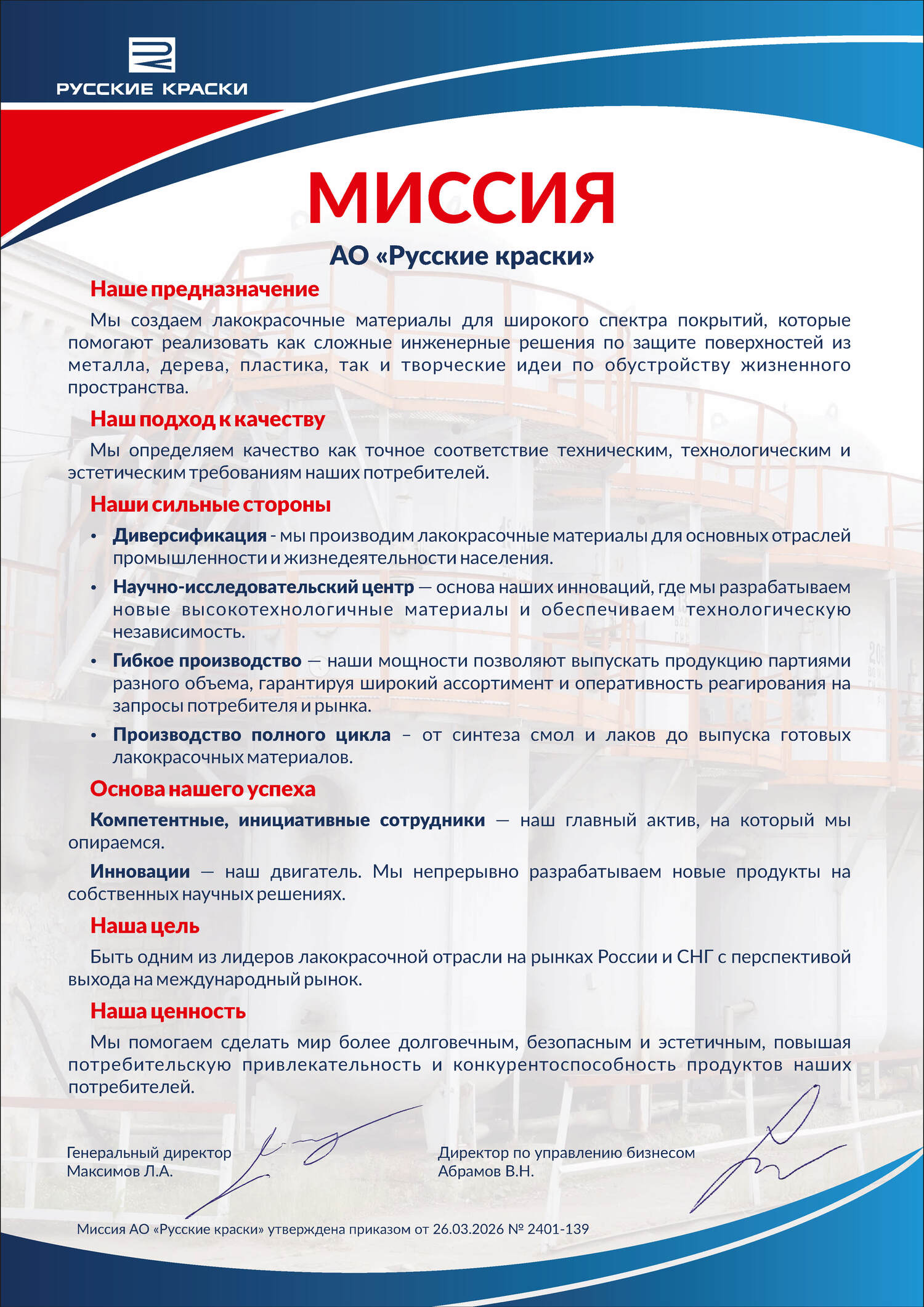 Стратегия компании основывается на производстве и реализации высокотехнологичных материалов. Благодаря использованию передового опыта управления, современным технологиям производства, обладая собственной базой научных разработок, «Русские краски» повышают свою конкурентоспособность высоким качеством, новизной, эксклюзивностью и техническим сопровождением выпускаемых лакокрасочных материалов.
