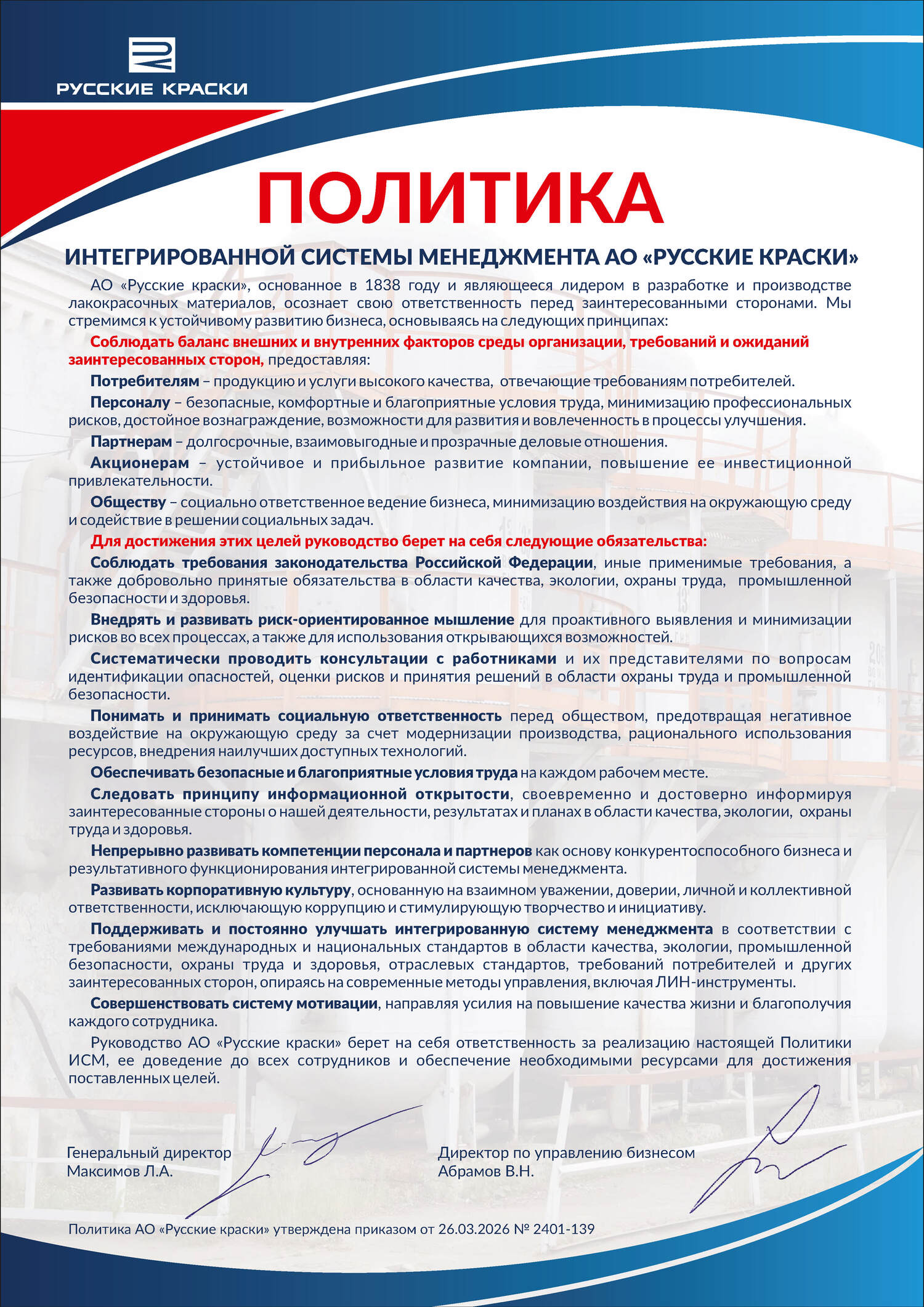Интегрированная Система Менеджмента (ИСМ) компании соответствует требованиям ISO 9001, ISO 14001, ISO 45001.